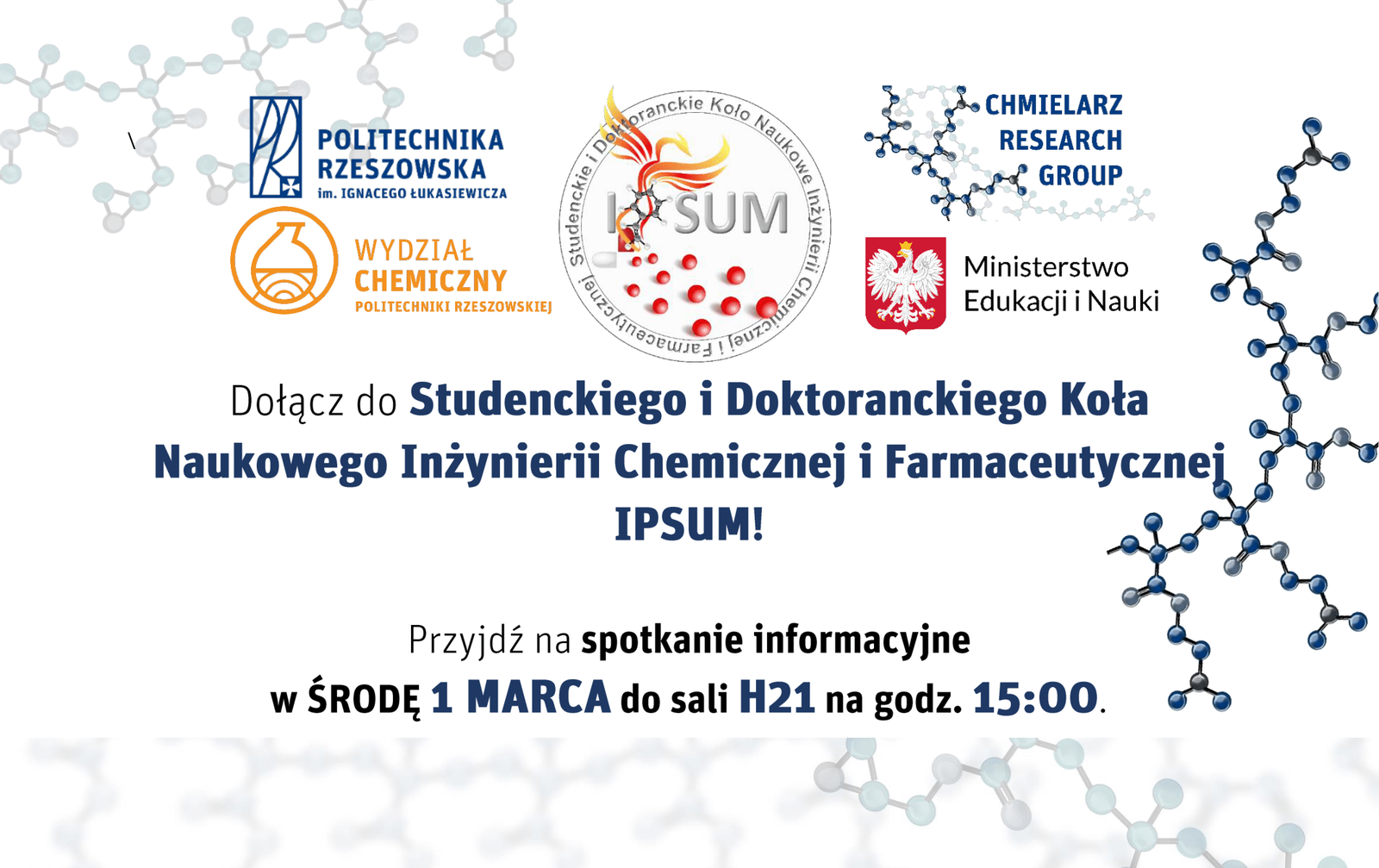 Zarząd oraz Członkowie Studenckiego i Doktoranckiego Koła Naukowego Inżynierii Chemicznej i Farmaceutycznej „IPSUM”, działającego na Wydziale Chemicznym Politechniki Rzeszowskiej, serdecznie zapraszają wszystkich studentów, chcących rozwijać swoją wiedzę w zakresie chemii polimerów oraz zdobywać doświadczenie w pracy laboratoryjnej, na spotkanie informacyjne Koła, które odbędzie się w środę 1 marca w sali H.21 o godzinie 15:00. W trakcie spotkania przedstawione zostaną zespoły laboratoryjne, a także realizowane projekty, w które będą mogli zaangażować się przyszli nowi członkowie Koła.